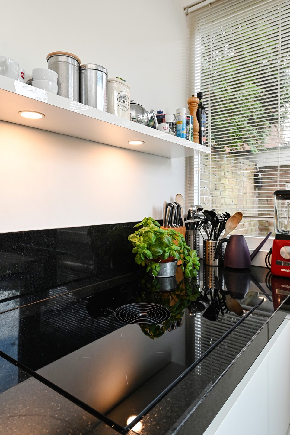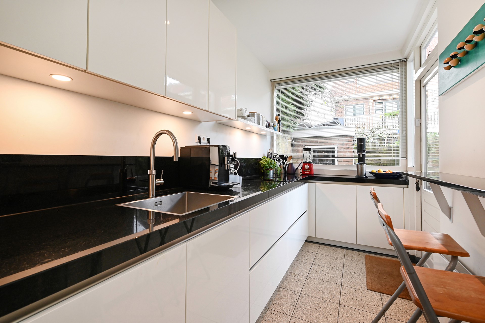 De moderne keuken bevindt zich in de uitbouw aan de achterzijde en is recent volledig vernieuwd. Dankzij de strakke afwerking, hoogwaardige inbouwapparatuur en praktische indeling is dit een prachtige plek voor iedereen die van koken houdt. De directe verbinding met de tuin maakt de keuken bovendien heerlijk licht en functioneel.