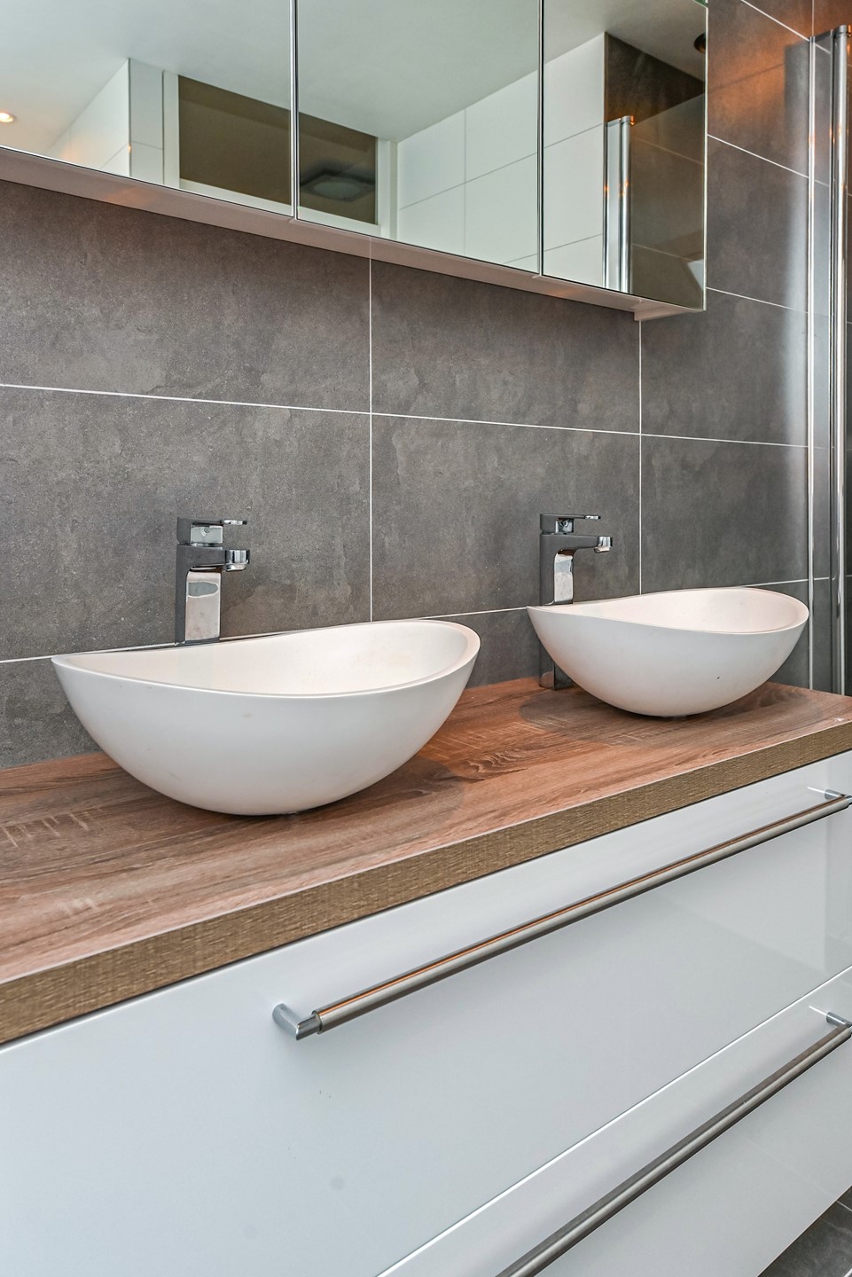Op de eerste verdieping zijn drie slaapkamers, waaronder één met een eigen balkon. Ideaal voor kinderen die graag een frisse neus halen of pubers die wat privacy willen. De moderne badkamer is voorzien van een ligbad, inloopdouche met regen- en handdouche, dubbele wastafel en vloerverwarming, dus altijd comfortabel. Op de overloop zit een apart toilet, wel zo handig in de ochtendspits!