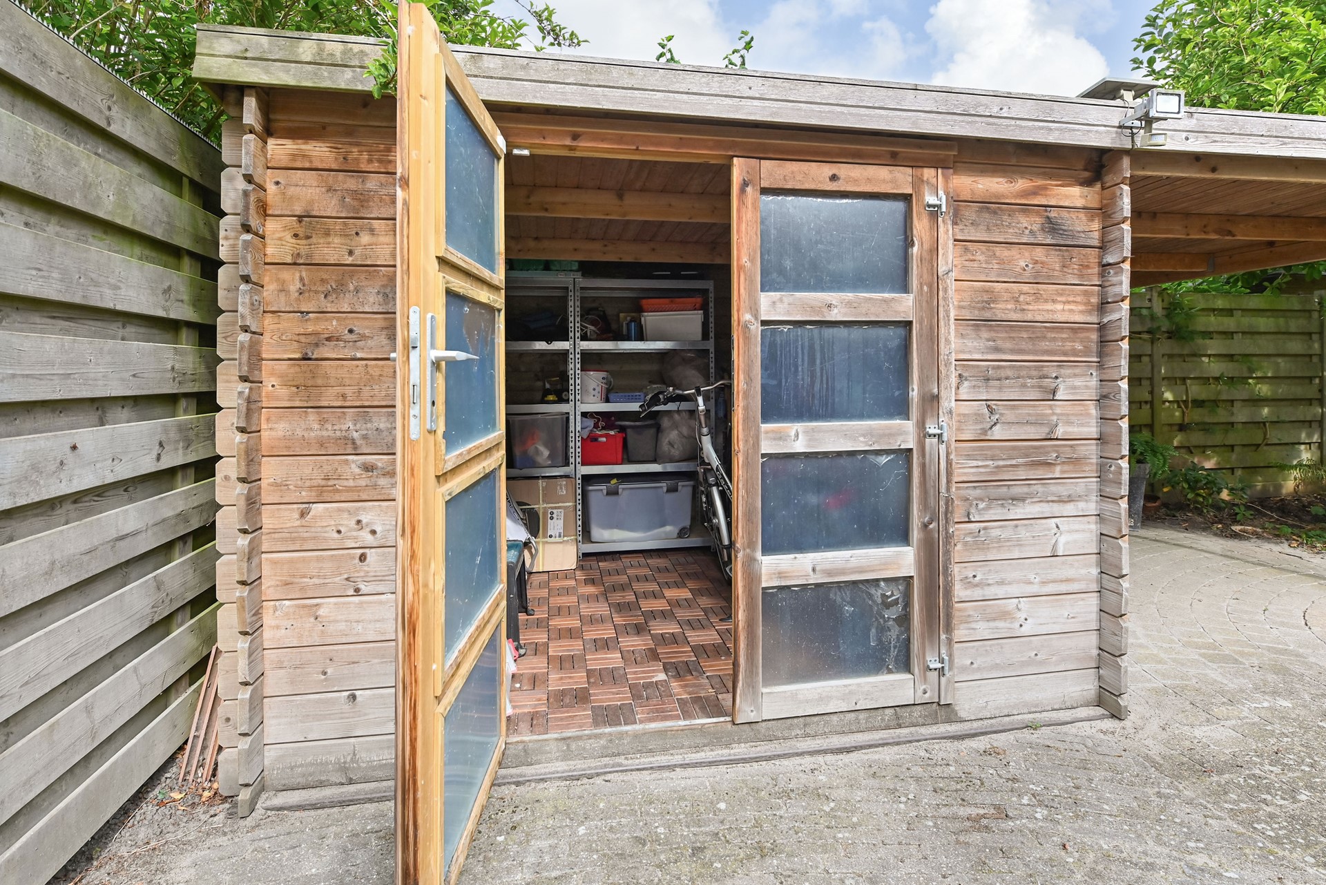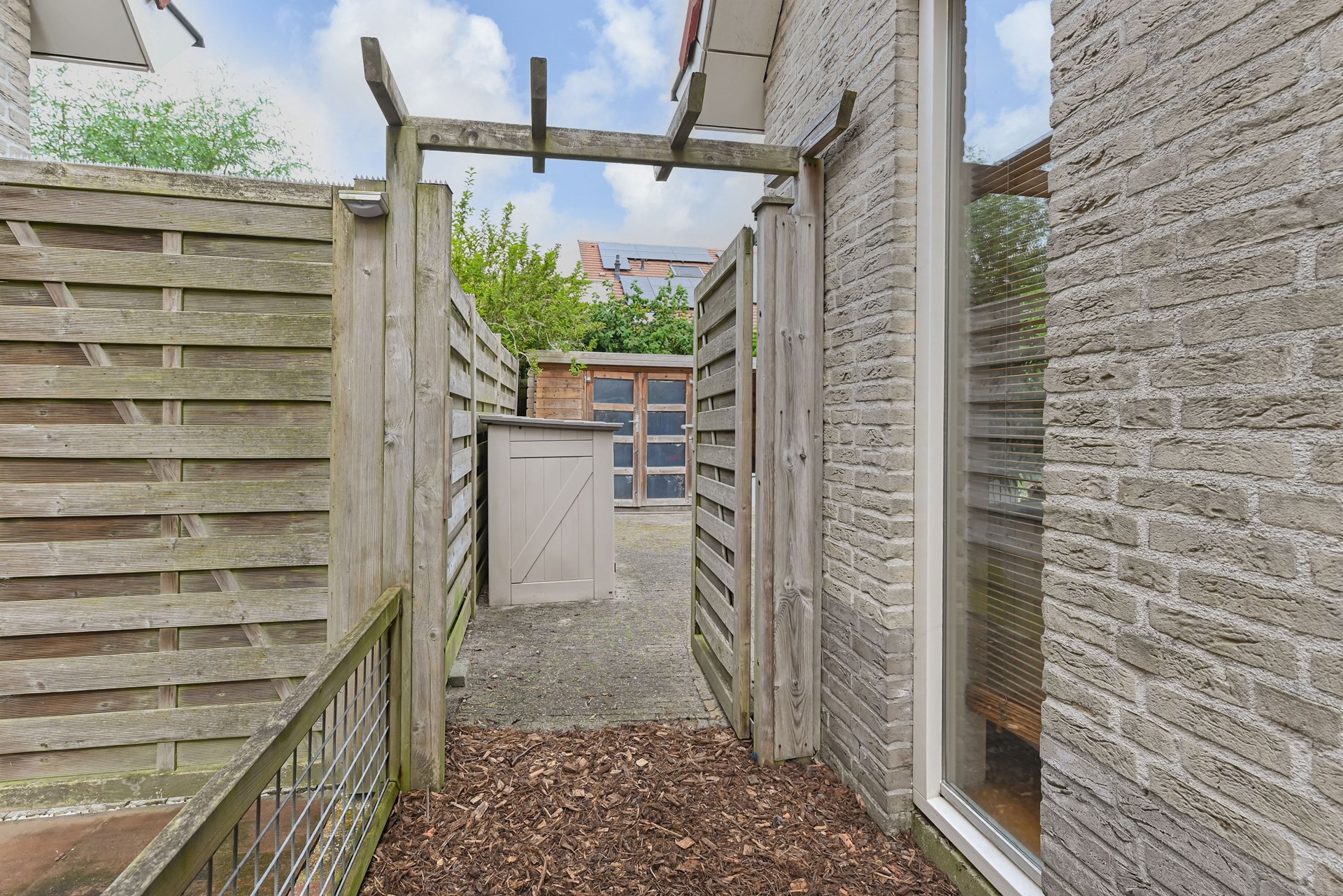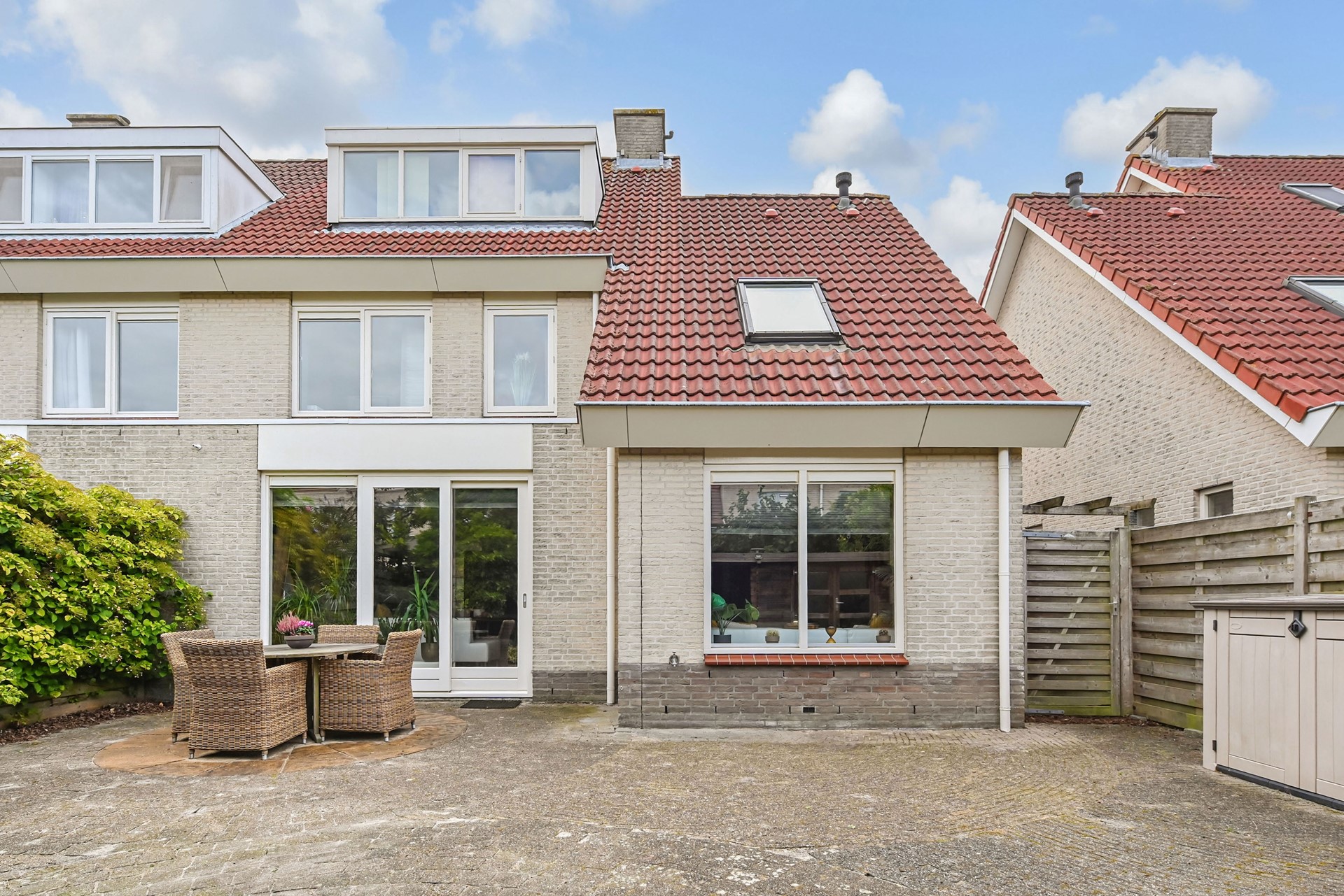 De achtertuin ligt op het noordwesten, dus er is bijna de hele dag wel een zonnig plekje te vinden. Extra fijn: de houten blokhut met overkapping zorgt voor gezellige zomeravonden, ook als het wat afkoelt.